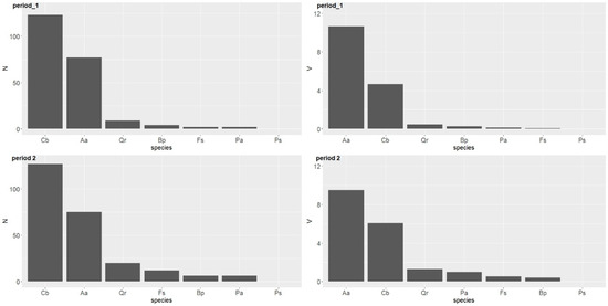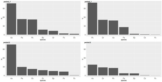 During the second period, the fir experienced the highest losses in terms of number and volume (Figure 6). The oak and pine showed a similar volume and had a similar number of trees removed. Other tree species were removed to a lesser extent (Table 4).