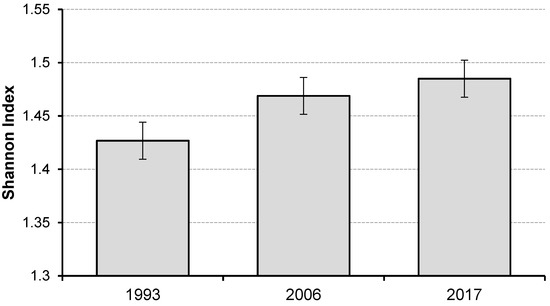 Change in mean values (and sample error) of Shannon species diversity SSP index over the 24-year period in the multispecies, uneven-aged forest.