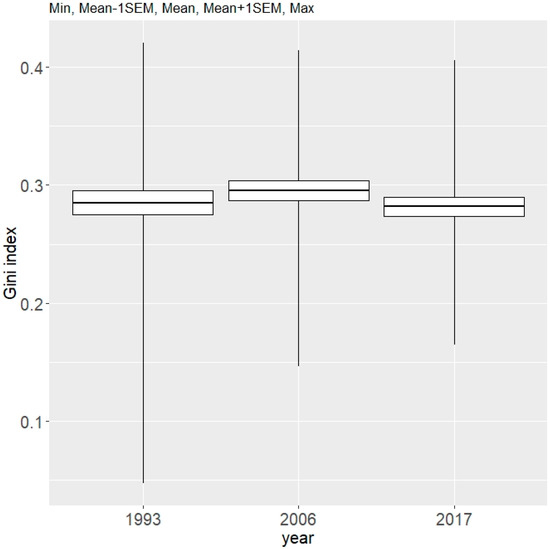 Mean values of Gini index (describing tree diameter inequality, regardless of tree species) for data from the 1993, 2006, and 2017 inventories conducted in the Unieszów Forestry Range.