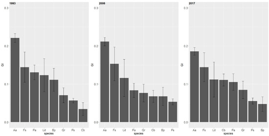 Analysis of species-specific GI index indicated that the highest value over the 24-year period was for the silver fir (Figure 10). In 1993 and 2006, the beech took second place (GI = 0.14 and GI = 0.15), followed by the other tree species. At the beginning, the lowest GI index was observed for the hornbeam (GI = 0.03). In 2017, the lowest GI index was observed for the birch and pine, while for the hornbeam the GI index clearly increased to 0.11 (Table S2, Supplementary Material).