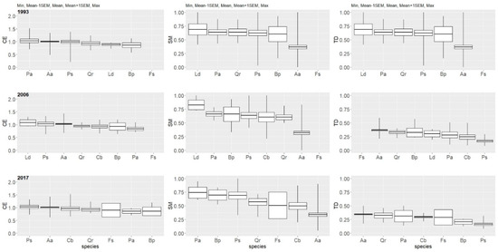 In 2017, the average SM index increased in comparison with 2006 for five tree species (Aa, Ps, Bp, Fs, and Pa) but decreased for two species—the oak and hornbeam (Figure 11). Average SM index values are presented in Figure S4 (Supplementary Material).