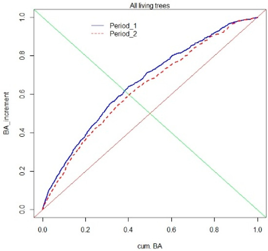 Growth dominance curves for the multispecies, uneven-aged forest, calculated for the basal area (BA) of all trees in both periods of observation.