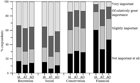 The objectives of owning forests varied between the owner groups (Figure 1). The largest differences were found in financial objectives. Overall, 60% of Inactive owners did not see their forest property as an important entity for financial gains, compared to 33% of Active owners. More Inactive than Active owners (15% compared to 6%) categorized intrinsic and heritage (social) objectives as a factor of no importance for owning forest. However, for all owners, recreational and social objectives were the most important of all objectives.