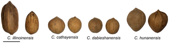 Pecan (Carya illinoinensis (Wangenh.) K. Koch), native to North America, is an important crop worldwide [1]. Pecan nuts are rich in unsaturated fatty acids, phenolics, and flavonoids and have good nutritional and health benefits [2,3,4]. The nut shell contains high levels of bioactive compounds, including tocopherols, phytosterols, total phenolics, and condensed tannins, and shows antioxidant, antimicrobial, and potential anticancer activity [5,6]. Meanwhile, the high oil content (>70% of the fresh weight) and high mono-unsaturated fatty acids content of the nut make pecan an excellent oil crop [4]. In addition, the biomass waste of the tree makes pecan a potential energy crop [7]. Previous studies have reported a significant variation in phytochemical profiles between different pecan cultivars [8,9]. Therefore, the identity verification and genetic study of this multipurpose tree are important.