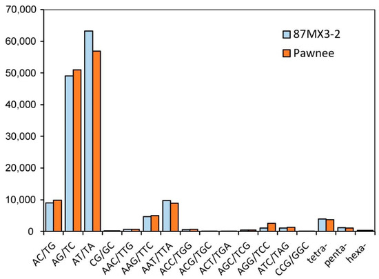 The genomic sequences of ‘87MX3-2’ and ‘Pawnee’ were downloaded and analyzed using the MISA program. The results showed that 48,009 (38.54%) out of 124,560 scaffolds (531.7 Mb) of ‘87MX3-2’ were found to contain SSR motifs (Table 2). In total, 145,714 gSSRs were confirmed (Table S1). So, the frequency of gSSR in ‘87MX3-2’ was 1 gSSR per 3.65 kb. Among different types of SSR motifs, the dinucleotide (121,626, 83.47%) was the most predominant, followed by trinucleotide (18,593, 12.76%) (Figure 2). For the dinucleotide repeat motif, AT/TA (53.60%) was the main type, while CG/GC (0.21%) was the least frequent. In total, 143,041 gSSRs were identified in 4955 (11.47% out of 43,183 examined sequences) sequences in the genome of ‘Pawnee’ (651.2 Mb; Table S1). The frequency of gSSR is 1 gSSR per 4.55 kb. Dinucleotide repeat motifs (118,045, 82.53%) formed the main category, followed by trinucleotide (19,818, 13.85%). The most and the least present types of dinucleotide repeat motif were AT/TA (48.22%) and CG/GC (0.22%), respectively.