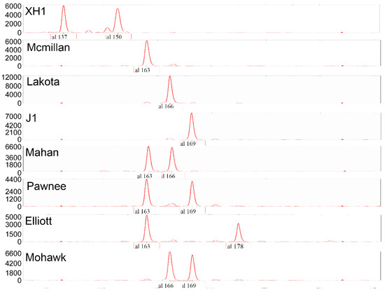 The capillary electrophoresis patterns of primer Ciz003 in eight pecan germplasms.