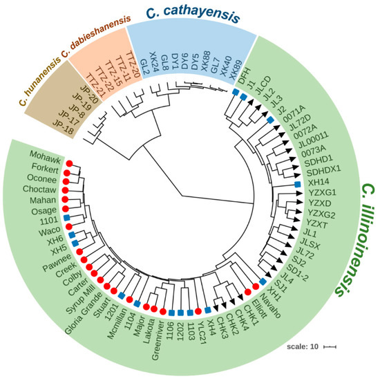 The dendrogram of 80 germplasms constructed by the unweighted pair group method with arithmetic average (UPGMA). The plant samples included 60 C. illinoinensis, 10 C. cathayensis, five C. dabieshanensis, and five C. hunanensis. The positions of cultivars, strains, and seeding plants of pecan are indicated by red circles, blue squares, and black triangles.