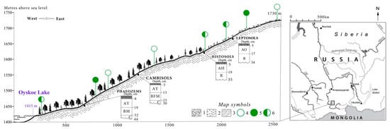 The background soils of the area are Hyperskeletic Histic Leptosols Humic, Folic Leptic Skeletic Histosols Arenic Hyperorganic, Leptic Skeletic Cambisols Arenic Ferric Humic, and Leptic Skeletic Cambic Phaeozems Arenic Hyperhumic (World Reference Base [15]). Leptosols are formed on the west slope on eluvial facies (altitude 1630–1730 m). The structure and granulometrical composition were not determined due to the absolute dominance of the mineral material in the profile. The depth of the soil profile was no more than 35 cm.