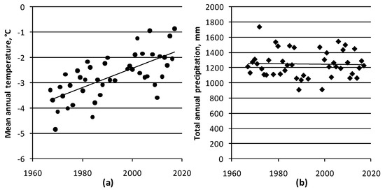Long-term climatic trends over the area of research: (a) Annual mean temperatures; (b) Total annual precipitation. Straight lines give an idea of linear components of the trends. The slope of the temperature trend (~0.038) is significant at p < 0.05, R2 = 0.45. The slope of precipitation trend (~−0.343) is not significant.