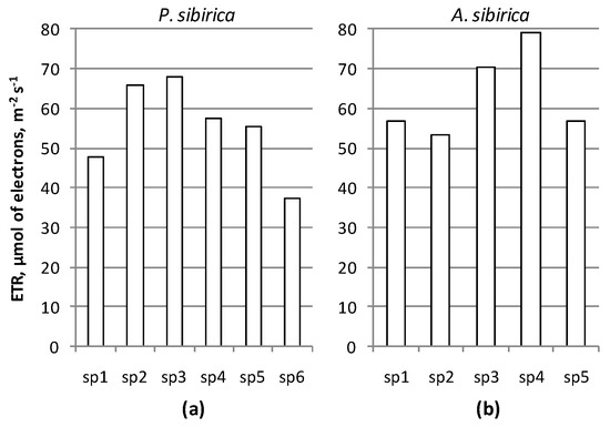Change of electron transport rate (ETR) (white bars) along the study slope: (a) P. sibirica; (b) A. sibirica. sp1–sp6 denote the numbers of sample points.