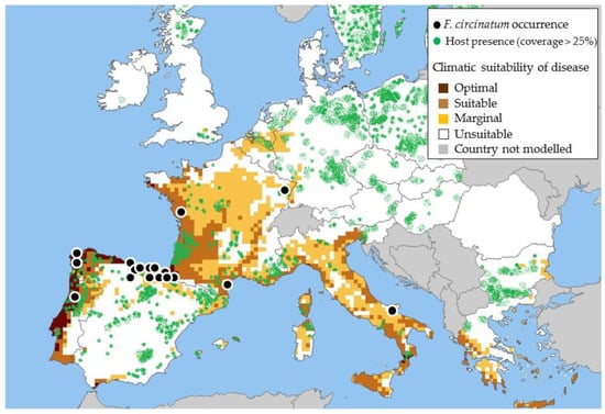 Fusarium circinatum has a strong potential to become established in different parts of Europe []. According to the European Food Safety Authority (EFSA), the consequences of PPC in areas suitable to its spread will be potentially massive []. Such areas include central and northern Portugal, northern and eastern Spain, south and coastal parts of France, coastal areas of Italy, several coastal areas of Greece, and some other regions [] (Figure 1). Although optimal conditions of temperature and humidity for fungal infection and conidial germination are known, the prediction of environmental suitability for PPC infection is complicated by the fact that the environment may affect not only F. circinatum itself, but also its hosts and vectors. Nevertheless, Garbelotto et al. [] have identified the natural climatic conditions which are associated with high and low or nil sporulation levels in the field. High sporulation is associated with high levels of relative humidity in the form of either precipitation or fog and cool temperatures (15–25 °C); sporulation is depressed as temperatures increase, and nil when minimum temperatures approach zero. These patterns suggest that the disease may spread more easily in coastal, mild, wet climates, rather than in mountainous or continental climates characterized by extreme seasonal fluctuations in temperature. The spatial spread of the inoculum was noted to be successful to a distance more than 200 m [] and up to a distance of 1000 m downwind [], but not much more, which indicates a limited dispersal ability. Numerous insect species that commonly occur in pine nurseries and forests throughout Europe and elsewhere have the potential to spread PPC as either vectors, carriers, or wounding agents; however, to date, most of the evidence is circumstantial and ambiguous [].