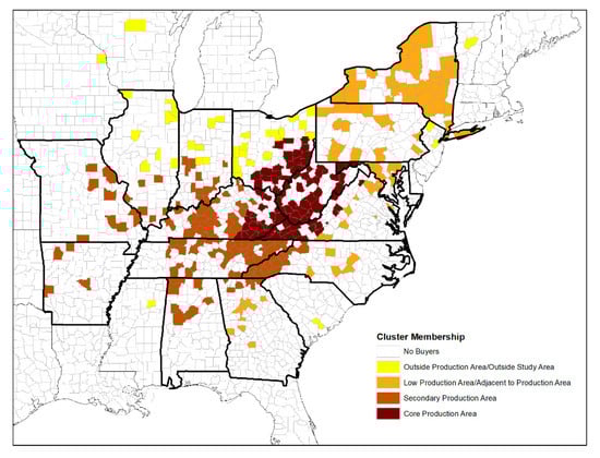 Most off-root purchases occurred in the Core Production area, which had the lowest mean population and highest dependence on natural resources and agricultural employment. It encompassed central Appalachia, with 75% of buyers coming from coal producing areas. Buyers in these areas were responsible for 90 percent of the total trade volume and a majority of all species surveyed. Around 9% of the total material came from the area of Secondary Production, and 20–40% of some individual species. Less than 1% of the total off-root trade volume came from Low Production and Outside/Adjacent clusters, which had the highest mean population and lowest dependence on natural resources and agricultural employment.