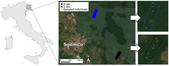 The study area was located near the village of Sgonico (North-Eastern Italy, 45° 44′ 12.1′′ N–13° 44′′ 56.4′′ E), in a woodland in the Karst Plateau, a limestone-dominated region on the border between Slovenia and Italy. The climate in the area is sub-Mediterranean with warm summers (average temperature in July of 22.7 °C), while winters are cold (average temperature in January of 3.9 °C). Mean annual rainfall exceeds 1200 mm, mostly occurring in spring and autumn (data from ARPA-OSMER https://www.meteo.fvg.it/clima/clima_fvg, reference period 1992–2019). The vegetation is composed by coniferous forests dominated by Pinus nigra that have suffered extensive dieback following anomalous summer droughts [], inter-mixed with deciduous woodlands dominated by Quercus pubescens, Fraxinus ornus, and Ostrya carpinifolia.