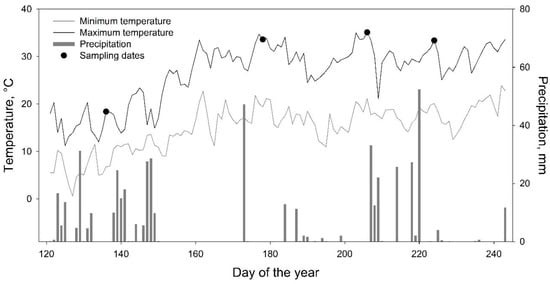 Maximum (black line) and minimum (grey line) temperature with precipitation (bars) values, measured in the meteorological station of Sgonico during summer 2019. Black circles denote field sampling dates.