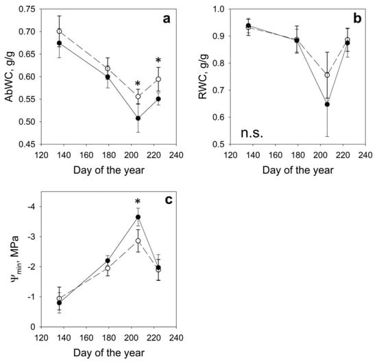 Mean values and associated standard deviation (error bars) of: (a) Absolute water content (AbWC, Pseudo R2 = 0.80); (b) relative water content (RWC, Pseudo R2 = 0.59); (c) minimum water potential (Ψmin, Pseudo R2 = 0.85), measured on F. ornus growing in H site (open circles) and in D site (black circles). * indicates statistically significant differences between the two sites (p < 0.05).