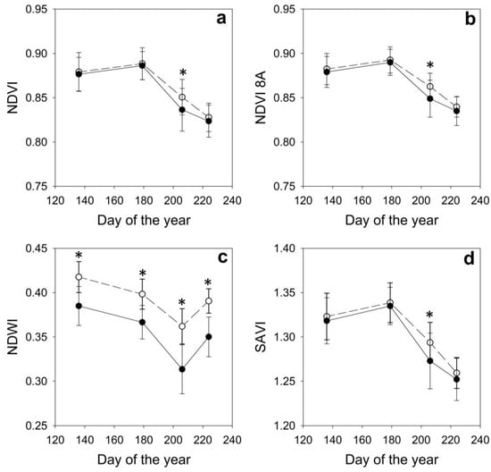 Mean values with standard deviation of: (a) Normalized difference vegetation index (NDVI, Pseudo R2 = 0.68); (b) normalized difference vegetation index calculated using the narrow near-infrared band (NDVI 8A, Pseudo R2 = 0.68); (c) normalized difference water index (NDWI, Pseudo R2 = 0.71); (d) soil-adjusted vegetation index (SAVI, Pseudo R2 = 0.50), calculated in H site (open circles) and in D site (black circles). * indicates statistically significant differences between the two sites (p < 0.05).
