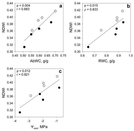 Correlations between absolute water content (AbWC, (a)), relative water content (RWC, (b)) and minimum water potential (Ψmin, (c)) vs. the normalized difference water index (NDWI) in H site (open circles) and in D site (black circles). Pearson’s r, Spearman’s rho (ρ) coefficients, and associated p-values (p) are also reported.