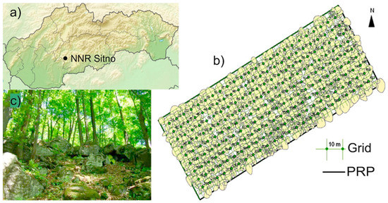 The study site (48°23′55″ N; 18°52′54″ E) is located in the National Nature Reserve (NNR) Sitno in the Štiavnicke Mts., which is part of the Western Carpathians (Figure 1). The reserve established in 1951 is located between 770 and 940 m asl with prevailing S and SE exposition. Mean annual precipitation sum is 907 mm. Mean annual temperature is 14 °C. Bedrock consists of volcanic rocks, andesite, and pyroxene. The predominant soil type is eutric cambisol, well aerated, with high share of rocks, and with rapid draining. The mixed beech-oak forests are naturally formed by more than eight tree species: Acer pseudoplatanus (L.), Acer platanoides (L.), Fraxinus excelsior (L.), Fagus sylvatica (L.), Tilia cordata (Mill.), Ulmus scabra (Huds.), Carpinus betulus (L.), and Quercus petraea (Matt.) Liebl. The research was conducted on a 2.5 ha (250 × 100 m) permanent research plot (PRP) established in the reserve in 2011 (Figure 1; [33]). The location of the plot was selected in the central core zone of the reserve (800–900 m asl) and corresponds with eumesotrophic site having a moderate-rich amount of dissolved nutrients. Study area comprises two main forest associations, Querceto-Fagetum tiliosum and Tilieto-Aceretum. Fagus and Quercus naturally represent this habitat with respective proportion from 30% to 50% and from 5% to 20%, and with higher admixture of above-mentioned broadleaved tree species.