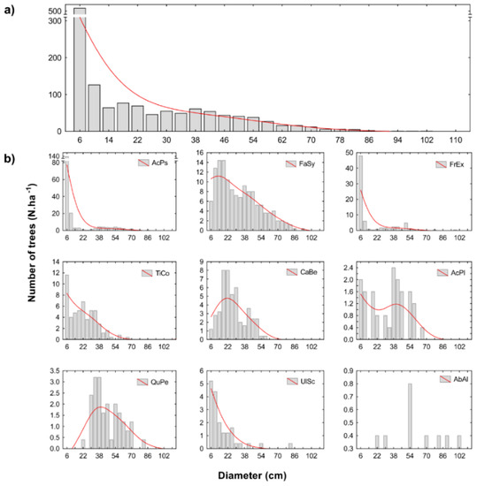 Diameter distributions of (a) all and (b) individual tree species on the permanent research plot Sitno (trees with dbh >4 cm). AcPs—A. pseudpolatanus, AcPl—A. platanoides, FrEx—F. excelsior, FaSy—F. sylvatica, TiCo—T. cordata, UlSc—U. scabra, CaBe—C. betulus, QuPe—Q. petraea, AbAl—A. alba.