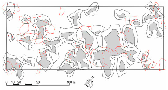 Based on the field mapping of the whole area, we identified 25 gaps, representing on average 10 gaps per hectare (Figure 3). Almost 60% of the PRP is covered by gaps (open canopy gaps—22.8%, expanded gaps—59.5%). Small expanded gaps (100–300 m2) represent 28% of the total number of gaps and 9% of the total area of gaps, large expanded gaps (300–1000 m2) account for 64% and 62% of the gap area, and very large expanded gaps (>1000 m2) account for 8% of the number of gaps and 29% of the gap area respectively (Figure A1).