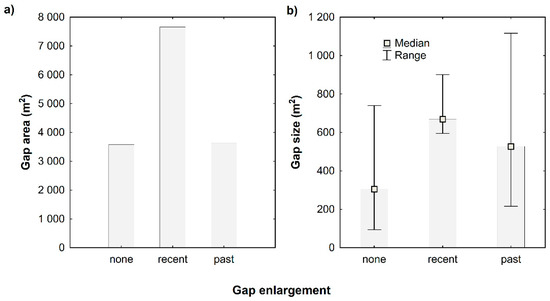 Gaps’ characteristics were described in terms of relative frequencies of gaps of different size classes, proportion of gap area on the study area and the number of gapmakers per gap and the degree of their decomposition according to Albrecht [34]. Gaps were further categorized based on the type of their enlargement (dynamics) into three categories: 1—no enlargement; 2—past enlargement; 3—recent enlargement. Gap openings originating from simultaneous death of one or more gapmakers with the identical degree of decomposition were included in enlargement category one. The second category was represented by gaps comprising two and more gapmakers of varying degree of decomposition, but non-including the first degree of decomposition. The third category represented gaps, in which gapmakers had varying degree of their decomposition including also the first degree.
