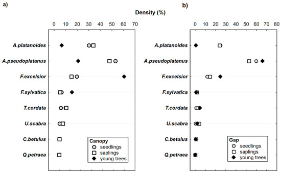 Under the canopy, relative densities of tree species more differ among regeneration categories than in gaps (Figure 5a). A. pseudoplatanus and platanoides show big decrease in relative density of young trees under the canopy. Other less presented species are even absent in the category of young trees under canopy, i.e., they are not able to survive. Oppositely, young trees of F. excelsior and F. sylvatica show increased densities indicating their better contemporary ability to survive the initial regeneration stages compared to all other species. Two species can grow and survive under canopy for a longer time—F. excelsior and F. sylvatica—under contemporary natural conditions.