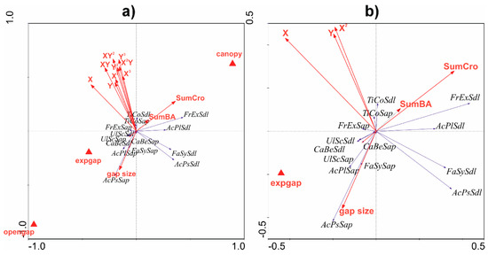 Graphical output of linear direct gradient analysis (redundancy analysis, RDA); (b) is extension of view on (a). Sdl—seedlings, Sap—saplings, AcPs—A. pseudpolatanus, AcPl—A. platanoides, FrEx—F. excelsior, FaSy—F. sylvatica, TiCo—T. cordata, UlSc—U. scabra, CaBe—C. betulus, SumCro—sum of crown projections of trees, SumBa—sum of basal areas of trees, expgap—expanded gap, gap size—size of the expanded gap, X,Y,X2—coordinates of sampling plots.