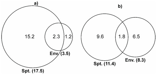 Variation partitioning between environmental (Env.) and spatial factors (Spt.). Venn diagrams display how much tree species variation of (a) seedlings and (b) saplings can be uniquely attributed to environmental (gap related) factors and how much variation they have in common.