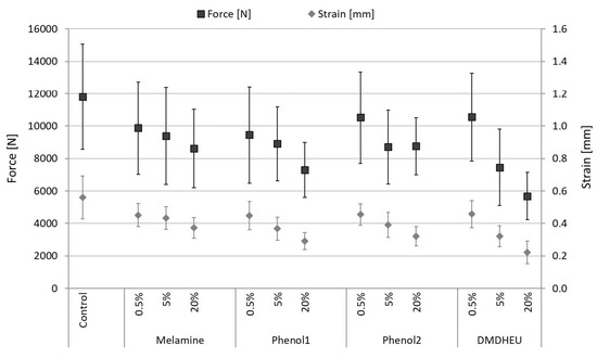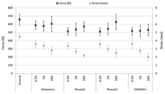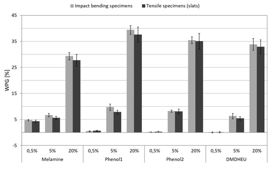 20] for DMDHEU, this study affirmed the strong influence of chemical modifications, especially on impact bending strength, and work to maximum load in traction already at a concentrations as low as 0.5%.
