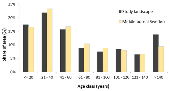 Age class distribution of the productive forest area in the study landscape and in the middle boreal Swedish region used to construct the study landscape.