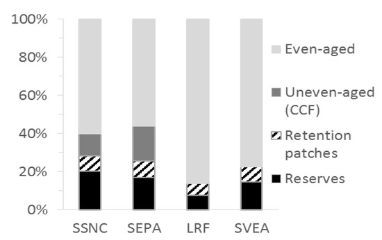 The four stakeholder scenarios varied considerably in the proportion of area under different management regimes (Figure 3). The proportion of unmanaged forests, or forests managed for nature conservation (nature reserves, key habitats and retention patches) varied between 15% (LRF) and 28% (SSNC), and the proportion of even-aged management varied between 22% (SEPA) and 85% (LRF). CCF was only applied in two of the scenarios (SSNC and SEPA).