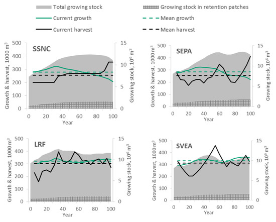 At the end of the 100-year simulation period, the growing stock of production forests was higher than the initial growing stock in all scenarios, with the largest increase in the SEPA scenario. However, in all scenarios, harvest volumes exceeded growth at times, leading to a temporary decrease in growing stock.