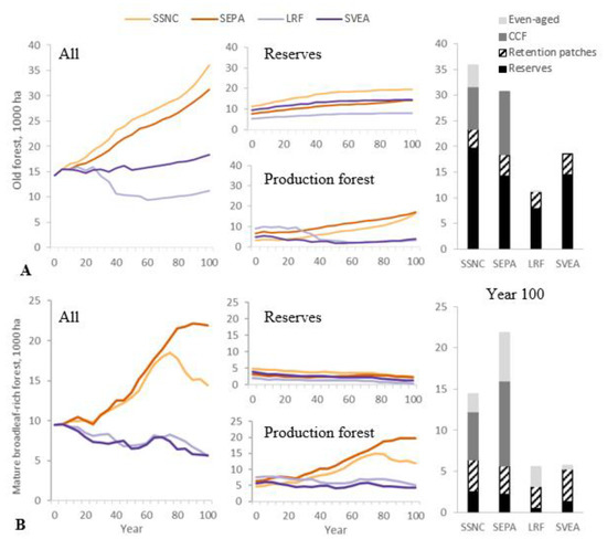 Area of old forest (age ≥ 140 years, A) and mature broadleaf-rich forest (B) in the four stakeholder scenarios; development over time in all forest (left), reserves and production forest (middle), and after 100 years under different management regimes (right).