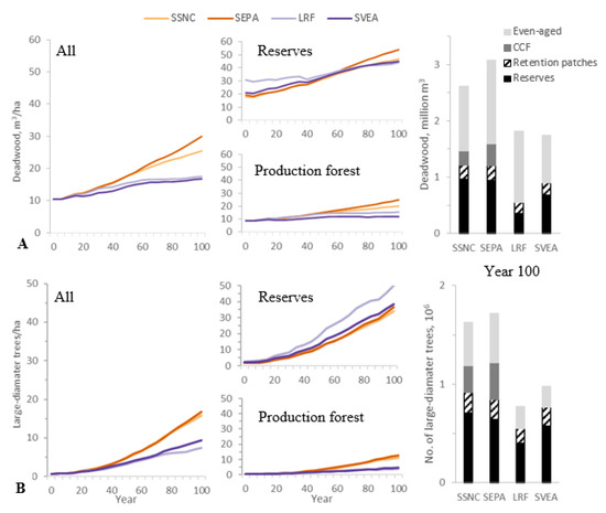 Deadwood volume (A) and number of large-diameter trees (B) in the four stakeholder scenarios; development over time in all forest (left), reserves and production forest (middle), and after 100 years under different management regimes (right).