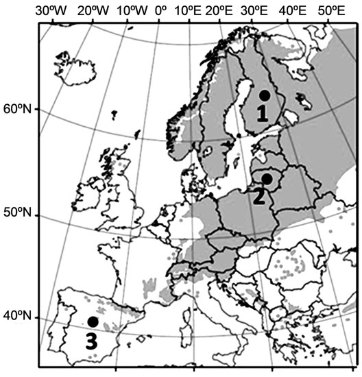 Figure 1. Location of the Finnish (1), Lithuanian (2) and Spanish (3) populations used in the study.