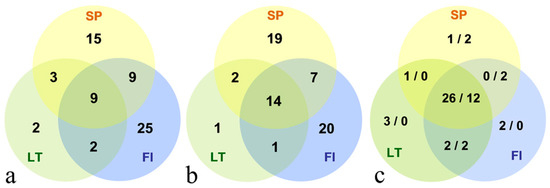 Figure 2. Quantitative distribution of differentially expressed protein spots identified by two-dimensional gel electrophoresis analysis of needle protein samples isolated from seedlings originating from the Spanish (SP), Finish (FI) and Lithuanian (LT) Scots pine populations. Number of differentially expressed protein spots between the populations under growth promoting conditions (a) and upon acclimation (b) is shown. Number of upregulated and downregulated protein spots upon acclimation treatment are indicated by numbers separated by slash (c). The portion of the cycles overlapping between two or all three populations indicate a number of protein spots that are differentially expressed between the two or among all three populations, respectively.