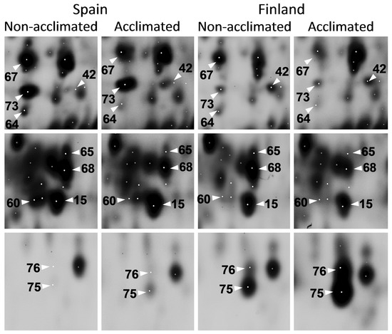 The average number of detected protein spots was 1464 ± 145 per gel after alignment (Figure S1). Analysis of biological variance revealed statistically significant and >2-fold variation in the abundance of 76 proteoforms among the six experimental groups (non-aclimated and acclimated seedlings from the Spanish, Lithuanian and Finnish populations) (Figure 2 and Figure 3). The largest number of unique differentially expressed protein spots were a characteristic of the Finnish population (25 and 20 in the non-acclimated and acclimated experimental groups, respectively), followed by the Spanish population (15 and 19). The Lithuanian population had the lowest number of unique spots (2 and 1) (Figure 2a,b). The number of proteoforms differentially expressed between populations was similar for the non-acclimated and acclimated experimental group. The abundance of 53 proteoforms changed after cold acclimation treatment (Figure 2c), and approx. 72% of the detected changes were independent of the seedling origin.