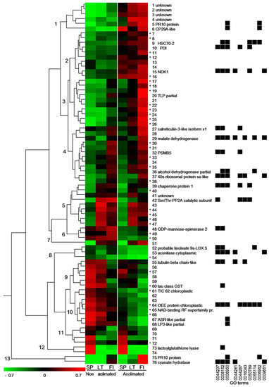 Figure 4. Cluster analysis of abundance of the 76 protein spots differentially expressed in needles of the Scots pine seedlings among the three populations and/or under cold acclimation treatment. The standardized abundance scale is show at the lower left corner. Thirteen major clusters are marked by numbers. Star indicates spots that were identified as mixtures of 2–4 proteins (listed in Table S1). GO terms associated with the identified unique protein sequences are shown on the right (the terms corresponding to the indicated numbers are listed in the Results section).