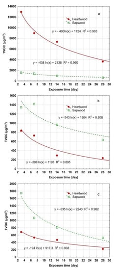 - For each tree species studied, the TVOC emission decreased with increasing sample exposure time in the chamber, and this relation could be described by a logarithmic function with a high coefficient of determination (R2 = 0.808–0.983).