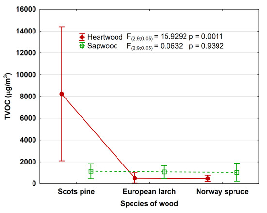 The interspecies differences in TVOC concentrations observed for heartwood were confirmed by the results of the performed ANOVA, which suggest that the differences in the concentrations were statistically significant for heartwood and insignificant for sapwood, because the value of the test statistic F equaled 15.9292 for heartwood and 0.0011 for sapwood (Figure 2). The calculated critical value was F(2;9;0.05) = 4.2565.