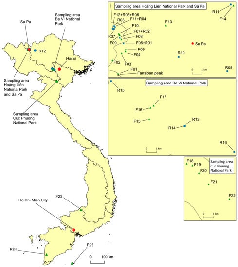 Location of the 25 forest sites (F01–F25; green triangles) and the 16 riparian sites (R01–R16; blue dots) included in the Phytophthora survey in Vietnam; blue triangles represent sites included in both the riparian and forest survey. For geographical coordinates and details of sites see Table 1 and Table 2.