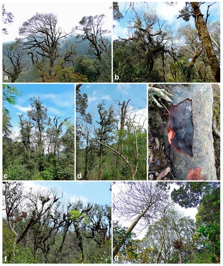 Disease symptoms of mature native trees in natural forest stands in Vietnam associated with presence of Phytophthora species in the rhizosphere; (a–f) montane evergreen cloud forests in Hoàng Liên National Park; (a) crown thinning and dieback of Quercus glauca in forest stand F03 (2337 m a.s.l.; P. cinnamomi A2); (b) crown dieback and mortality of Castanopsis acuminatissima and Neolitsea poilanei in forest stand F05 (2249 m a.s.l.; P. attenuata, P. castaneae, P. cinnamomi A2); (c,d,f) severe crown dieback and mortality of C. acuminatissima in a swampy depression of forest stand F06 close to stream R01 (2083 m a.s.l.; P. castaneae, P. cinnamomi A2, P. gregata); (f) the white flowers and young leaves in the crowns of C. acuminatissima belong to the epiphytic Rhododendron leptocladus; (e) bark lesion with staining of the underlying cambium caused by P. cinnamomi A2 on a surface root of C. acuminatissima in forest stand F07; (g) mortality of Dysoxylum juglans in suptropical humid evergreen forest stand F15 in Ba Vì National Park (1108 m a.s.l.; P. sp. attenuata-like 3).