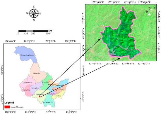 The study area was located at the Maoer Mountain Experimental Forest Farm of the Northeast Forestry University, Shangzhi City, Heilongjiang Province, China (45°24′–45°25′ N, 127°34′–127°40′ E), 30 km from north to south and 26 km from east to west, with an area of approximately 260 km2 (Figure 1). In this area, the forest coverage is 85% and the total forest stock is 20,500 km2, with an elevation of 200–805 m. The climate is a temperate continental monsoon climate. The annual average temperature is 2.8 °C, the lowest temperature in January is –31.9 °C, and the highest temperature in July is 26.1 °C. The annual rainfall is 720 mm and is mainly concentrated in July and August, which accounts for more than half of the total value for the year. The vegetation mainly includes Mongolian oak (Quercus mongolica), Korean pine (Pinus koraiensis), walnut (Juglans mandshurica), ash (Fraxinus mandchurica Rupr.), and poplar (Populus davidiana Dode).