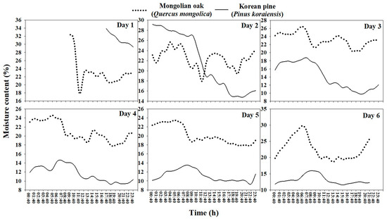 When the litter moisture content is higher than 35%, it is difficult for it to ignite and cause forest fires [46]. Therefore, all the data in this paper were analyzed for a moisture content of less than 35%. For the oak litter, a total of 133 data records were collected from 18 May 2017 at 9:40 to 23 May 2017 at 21:40, and for the pine litter, a total of 125 data records were collected from 18 May 2017 at 17:40 to 23 May 2017 at 21:40.