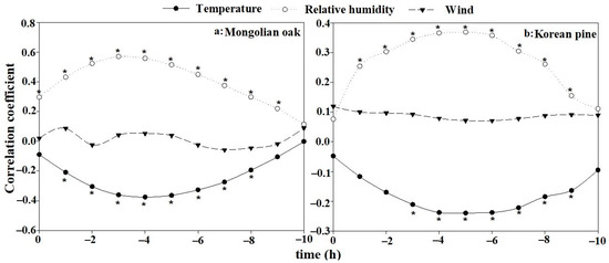 The change in the moisture content of the oak litter as a response to meteorological factors was stronger than that of the pine. The litter moisture content was negatively correlated with the air temperature and positively correlated with the relative humidity. The correlation coefficient first increased and then decreased with lagging time. For the oak, the temperature and humidity 3 h before had the most significant effect on the litter moisture content. For the pine, the temperature and humidity 5 h before had the most significant effect on the litter moisture content (Figure 3). Wind speed had no significant effect on the change in litter moisture content.