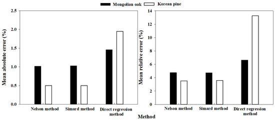 For Mongolian oak, the MAEs based on the Nelson, Simard, and meteorological factor regression methods were 1.02%, 1.03%, and 1.46%, respectively, with corresponding MREs of 4.76%, 4.73%, and 6.65%. The MAEs of the three prediction models for the diurnal variation in litter moisture content of the pine litters were 0.50%, 0.50%, and 1.95%, respectively, and the corresponding MREs were 3.53%, 3.59%, and 13.26%. For the direct estimation method, the prediction performance of the litter moisture content model was better for pine than for oak, while the opposite performance trend was observed in the case of the meteorological factor regression method for the two forest types. The direct estimation method was better than the regression method for both forest types (Figure 4).