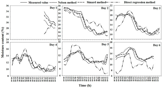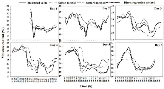 The performance of the prediction of litter moisture content model for pine was similar to that for oak. The meteorological factor regression method had the worst prediction effect but also showed a certain lag. The predicted results of the Nelson and Simard methods were also similar to each other, but the errors between the predicted values and the measured values at different stages of the day showed a certain regularity; that is, from approximately 9:40 to 17:40, the measured values were slightly higher than the predicted values, while in the remaining stages of the day, the measured values were lower than the predicted values. The error of the direct estimation method mainly occurred when the litter moisture content reached its peak value, and the model performance was good for all other times (Figure 6).