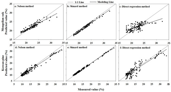 Comparisons of measured and predicted values. (a–c) indicate the comparisons of measure and predicted values of Mongolian oak by Nelson, Simard and Direct regression methods, respectively; (d–f) indicates the comparisons of measure and predicted values of Korean pine by Nelson, Simard and Direct regression methods, respectively.