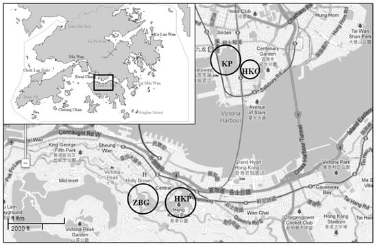 A map of Hong Kong and locations of the four parks, Hong Kong Park (HKP), Hong Kong Zoological and Botanical Garden (ZBG), Kowloon Park (KP), and Hong Kong Observatory Grounds (HKO) sampled in this study. (http://www.hko.gov.hk/tide/marine/hko.htm, https://maps.google.com.hk/).