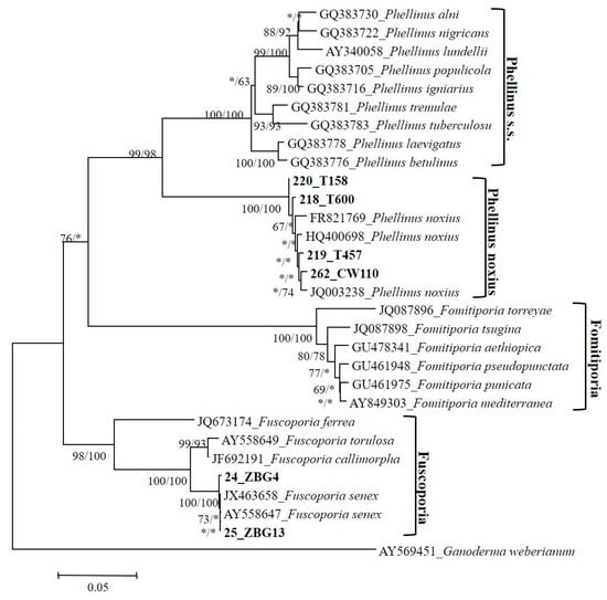 The phylogeny based on multiple sequence alignment showed that the dominant wood-decay fungi detected in this study were affiliated with the orders of Hymenochaetales (Figure 2) and Polyporales (Figure 3). Within the order of Hymenochaetales, two genera, Phellinus and Fuscoporia, were identified and both are important pathogenic wood-decay fungi affiliated with the family of Hymenochaetaceae (Figure 2). Within in the order of Polyporales, multiple fungal species were identified, and they belong to four families: Ganodermataceae, Polyporaceae, Phanerochaetaceae and Meripilaceae (Figure 3).